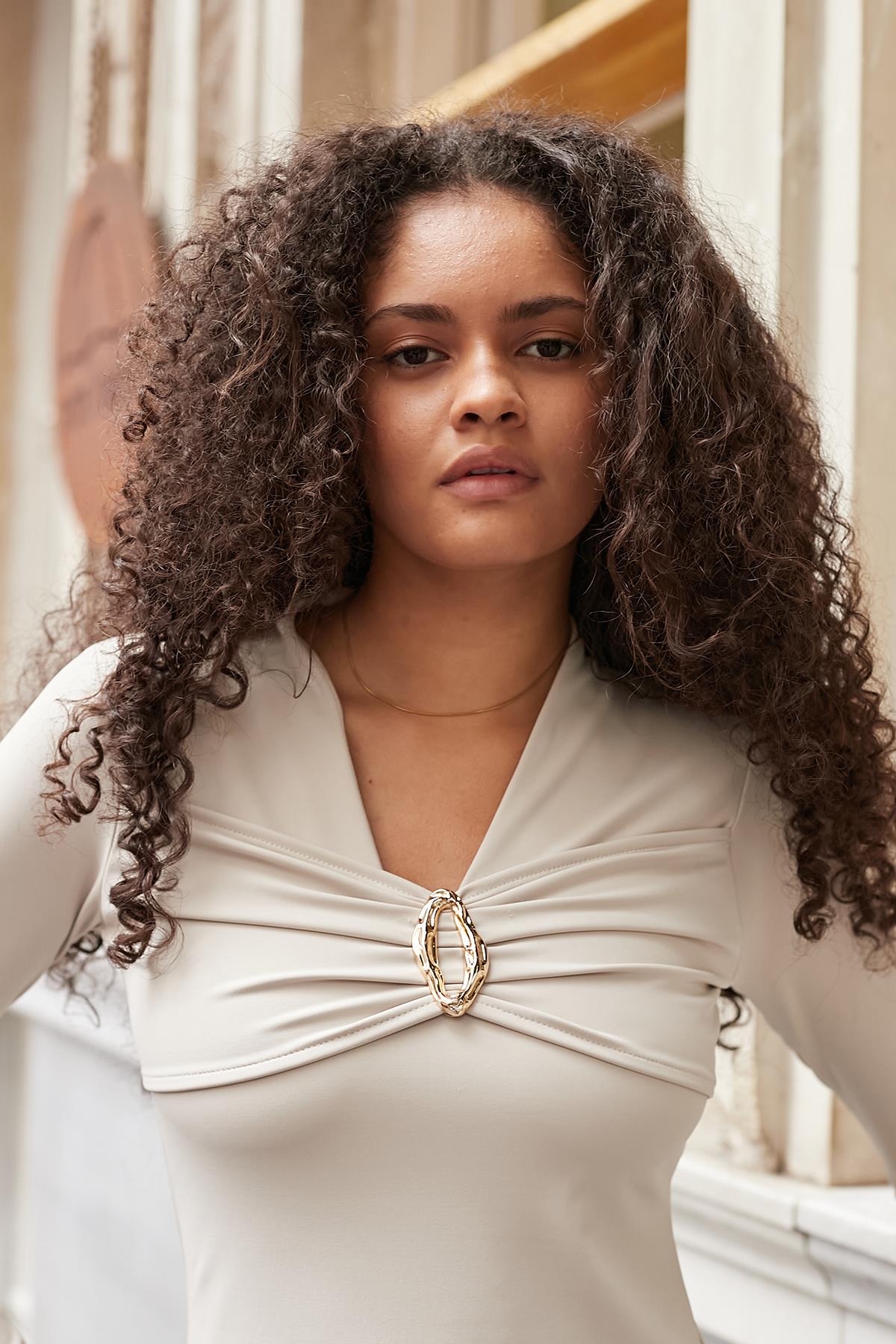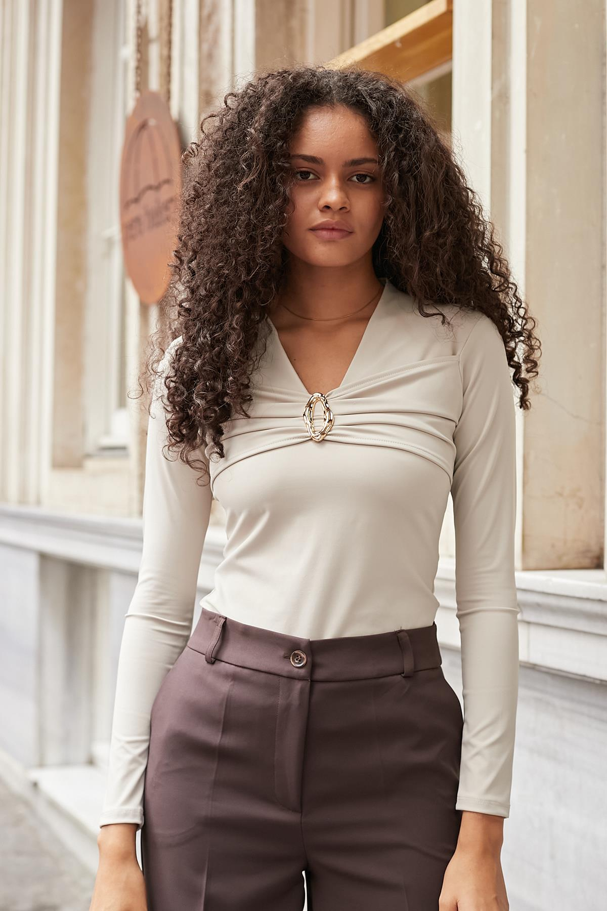 kadın v yaka önü büzgülü aksesuarlı uzun kol bluz (20558)