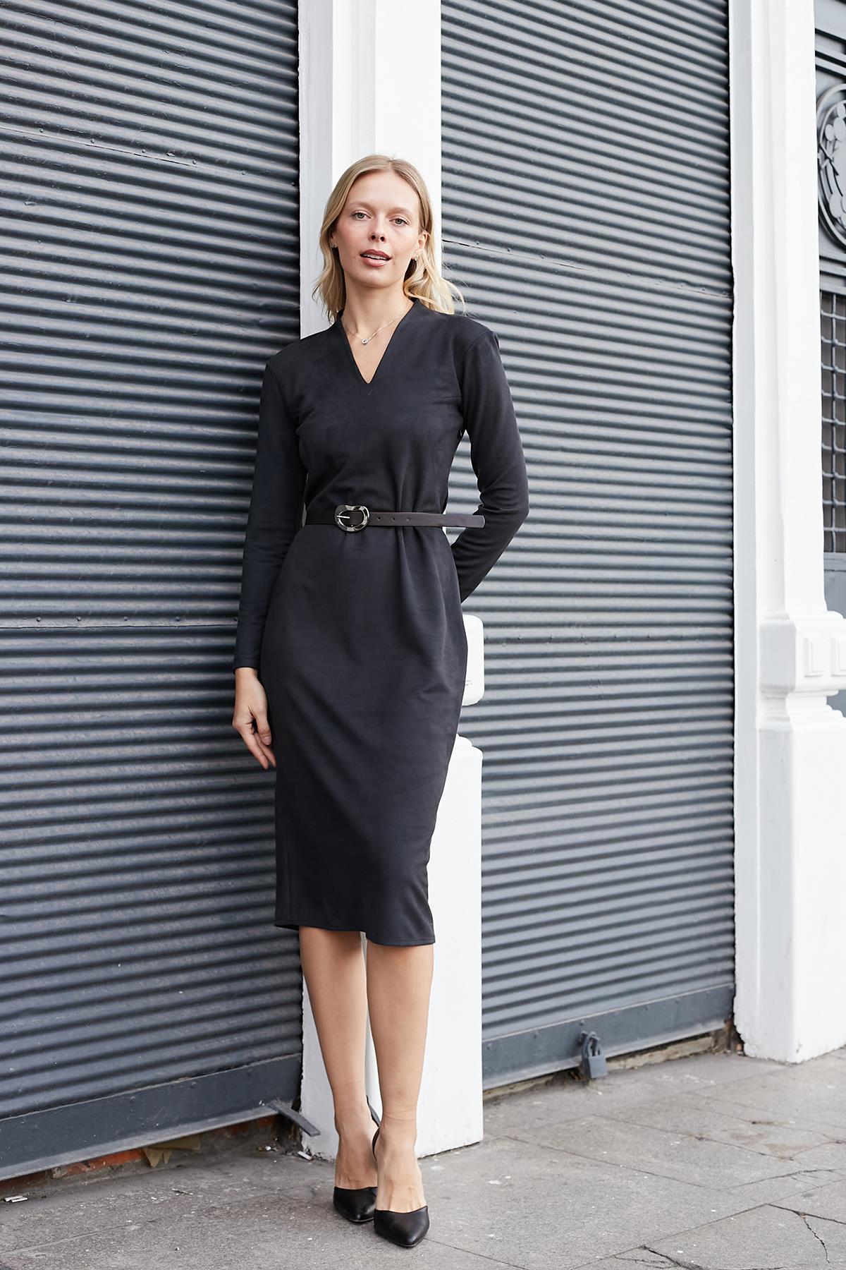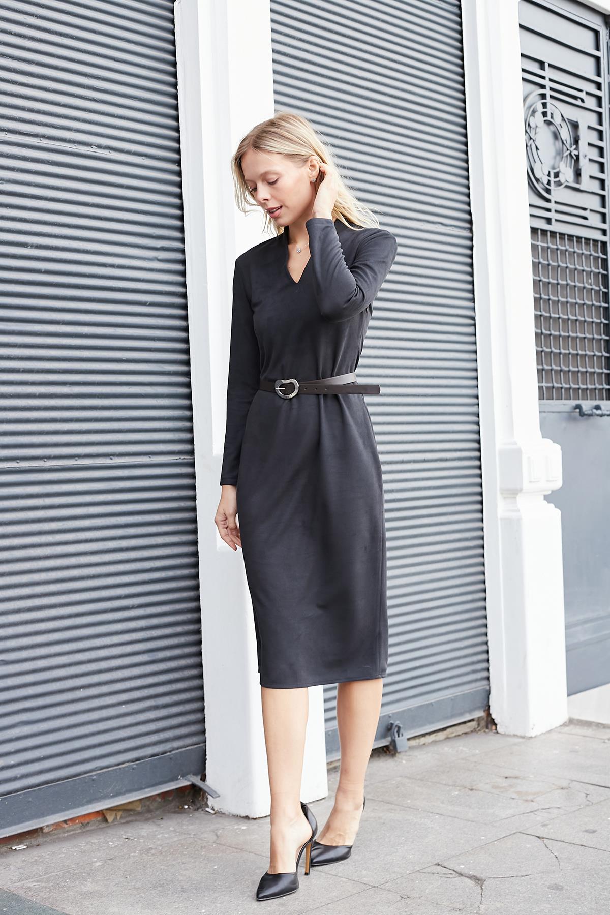 kadın diyagonal v yaka uzun kol yırtmaçlı deri kemerli diz altı elbise (50236)