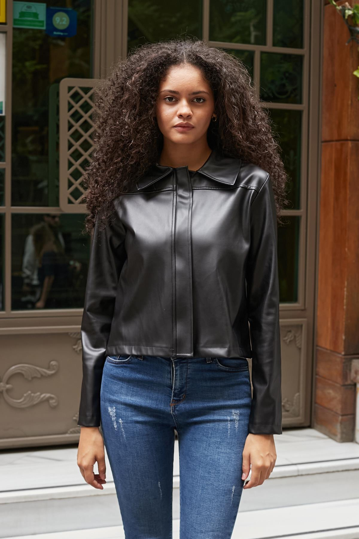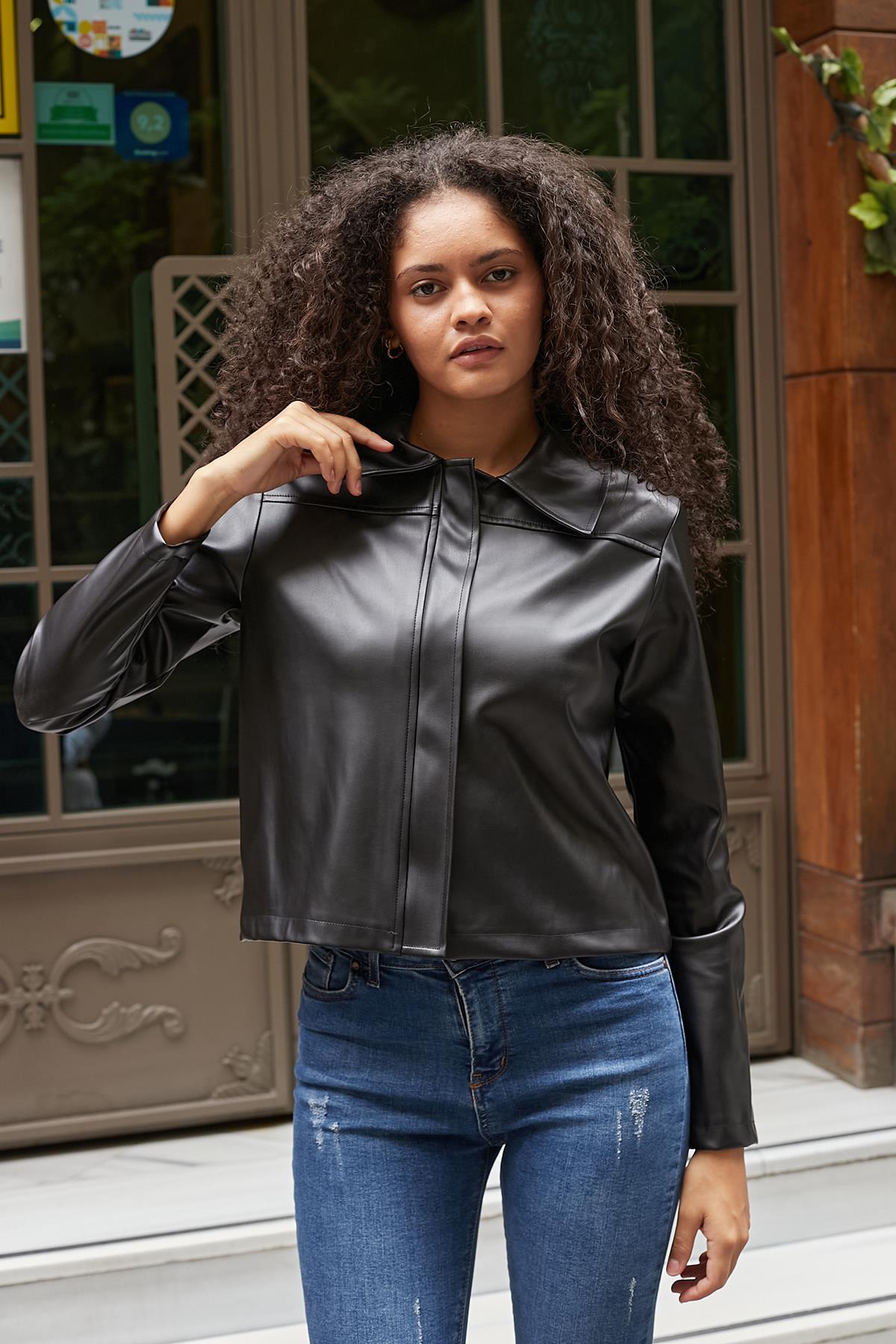 Kadın Ekolojik Deri Fermuarlı Uzun Kol Kaban-Siyah (110021)