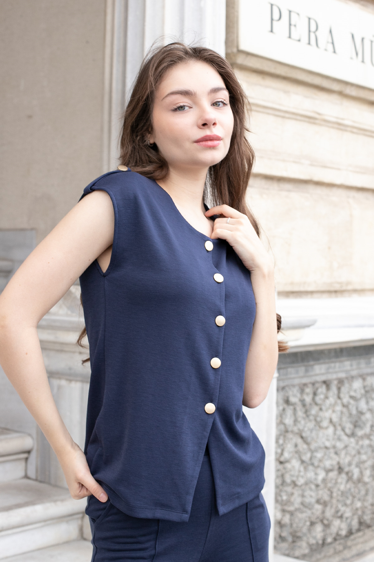 Kadın Esnek İpeksi Kumaş Geniş Sıfır Yaka Düğmeli Düşük Omuzlu Ceket Bluz-Lacivert (20571)