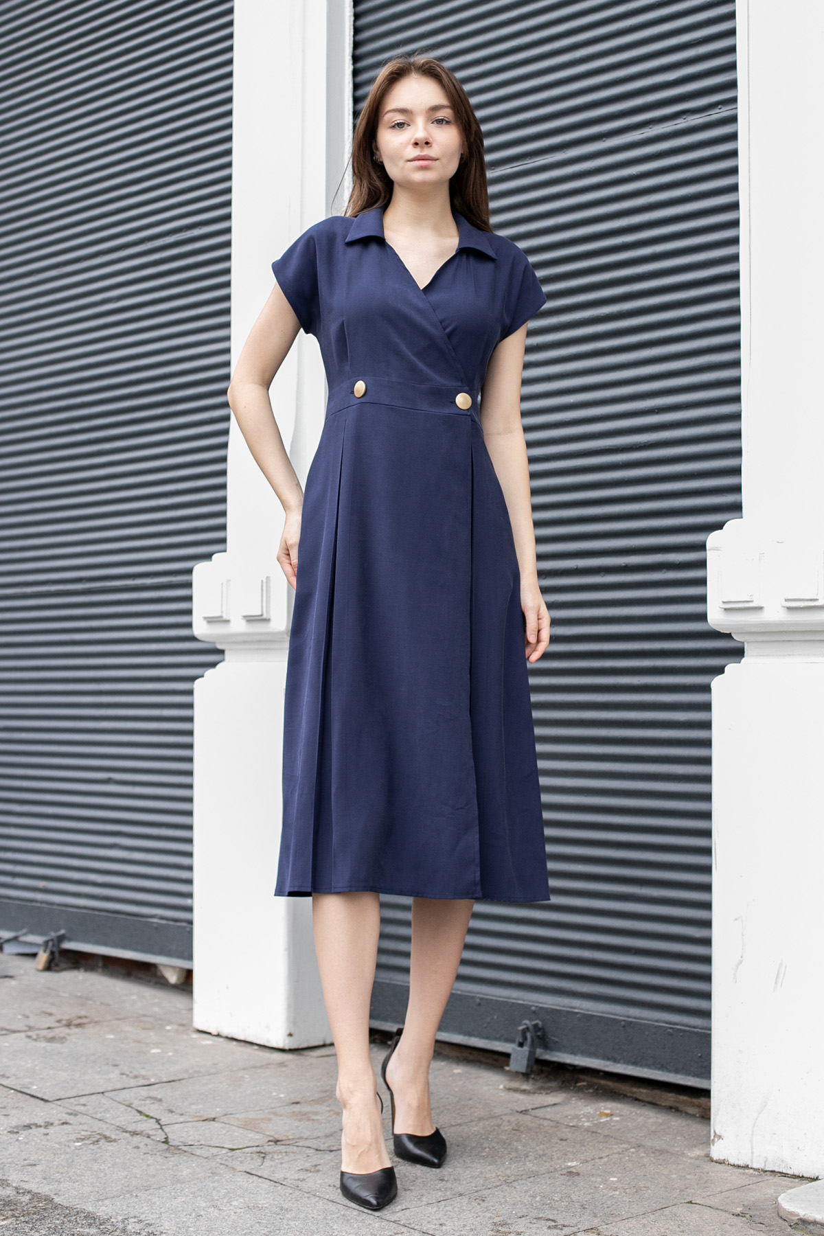 Kadın Modal Diyagonal Kruvaze Anvelop Yakalı Eteği Pili Kaşeli Cepli Midi Boy Diz Altı Elbise-Lacivert (40117)