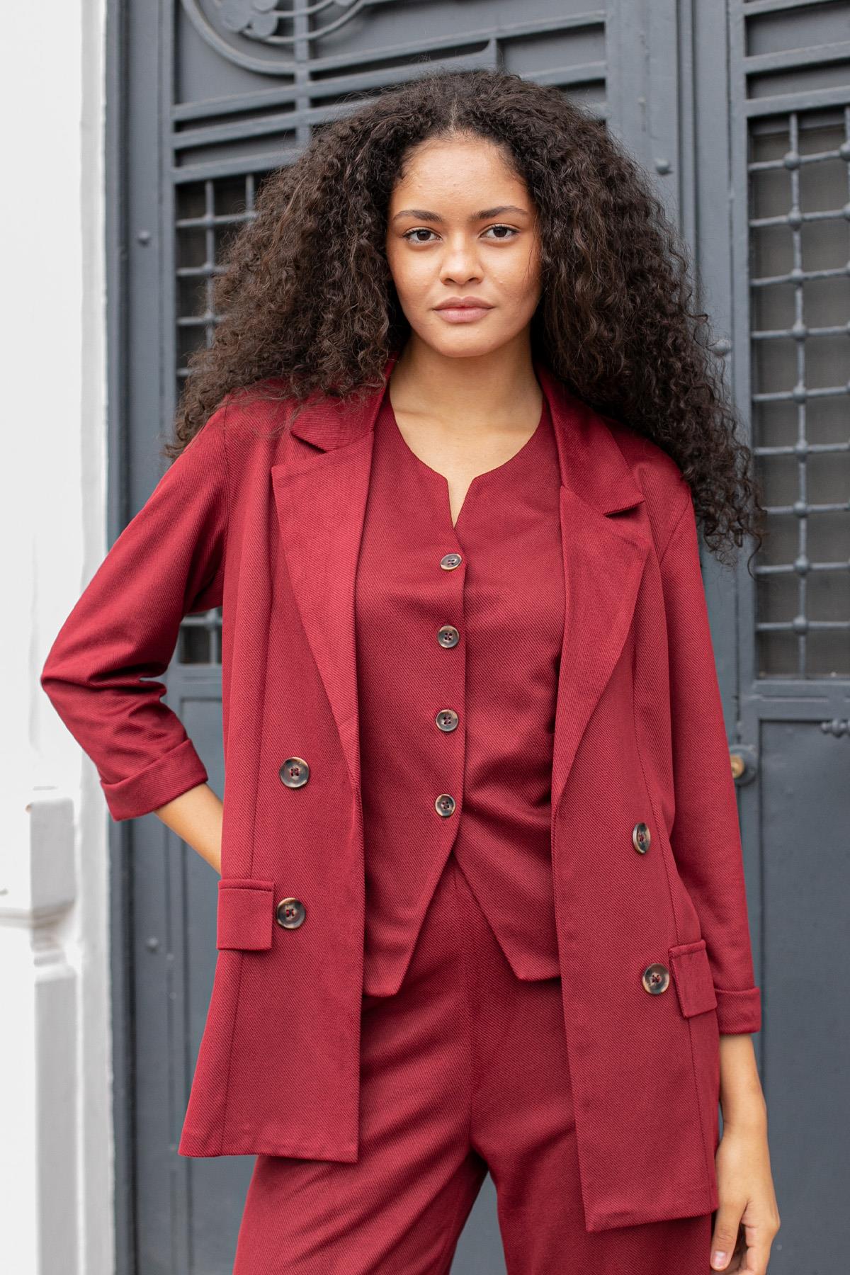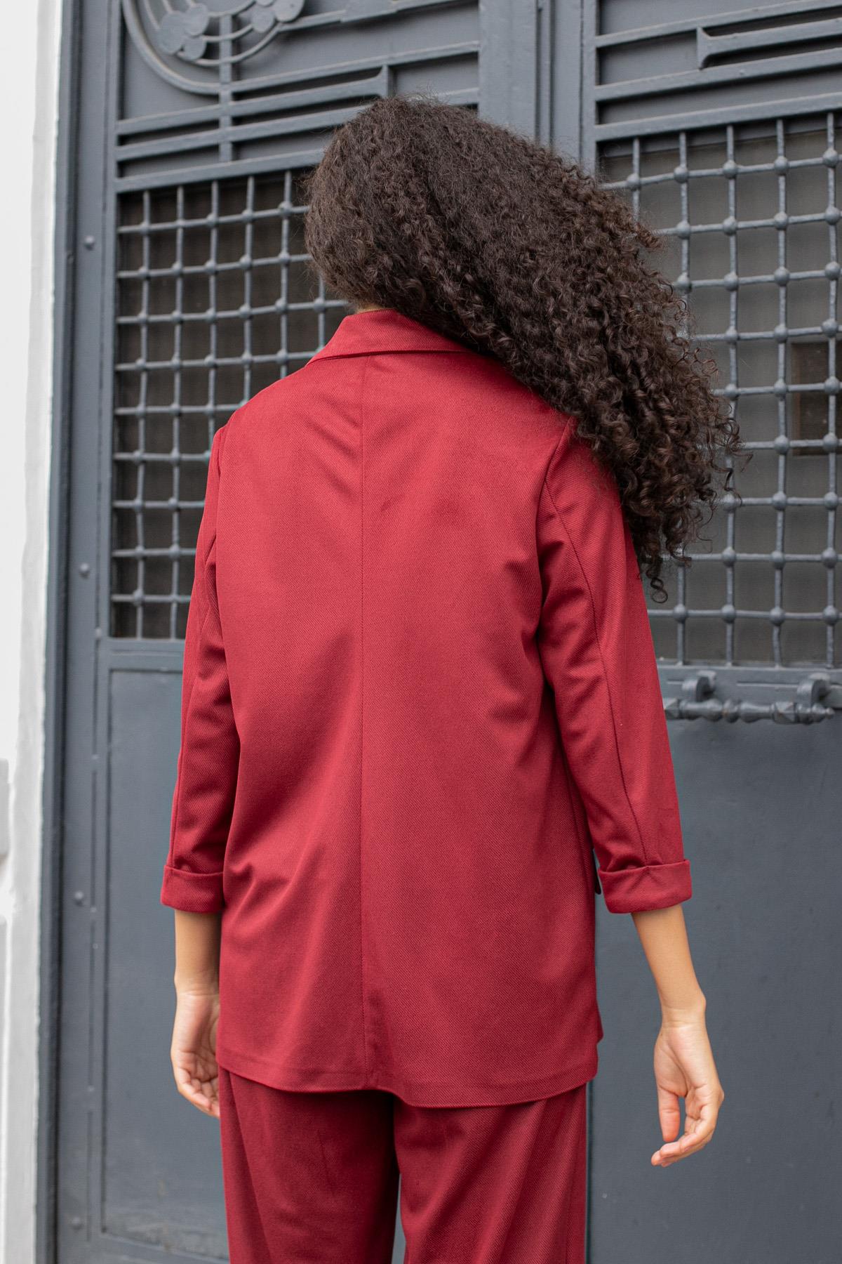Kadın Süet Dokulu Kumaş Yakalı Capri Kol Cep Kapaklı Blazer Ceket-Bordo (30100)