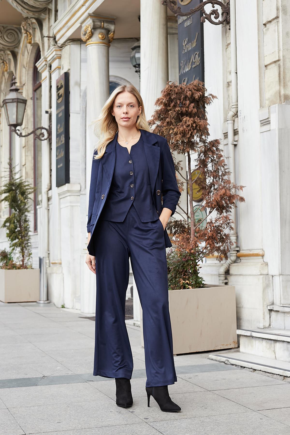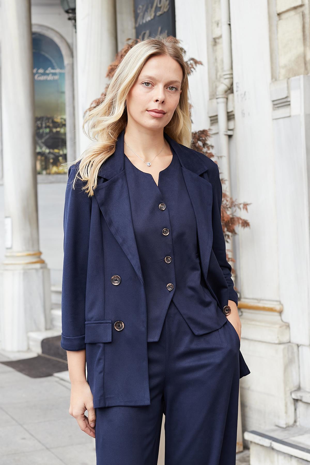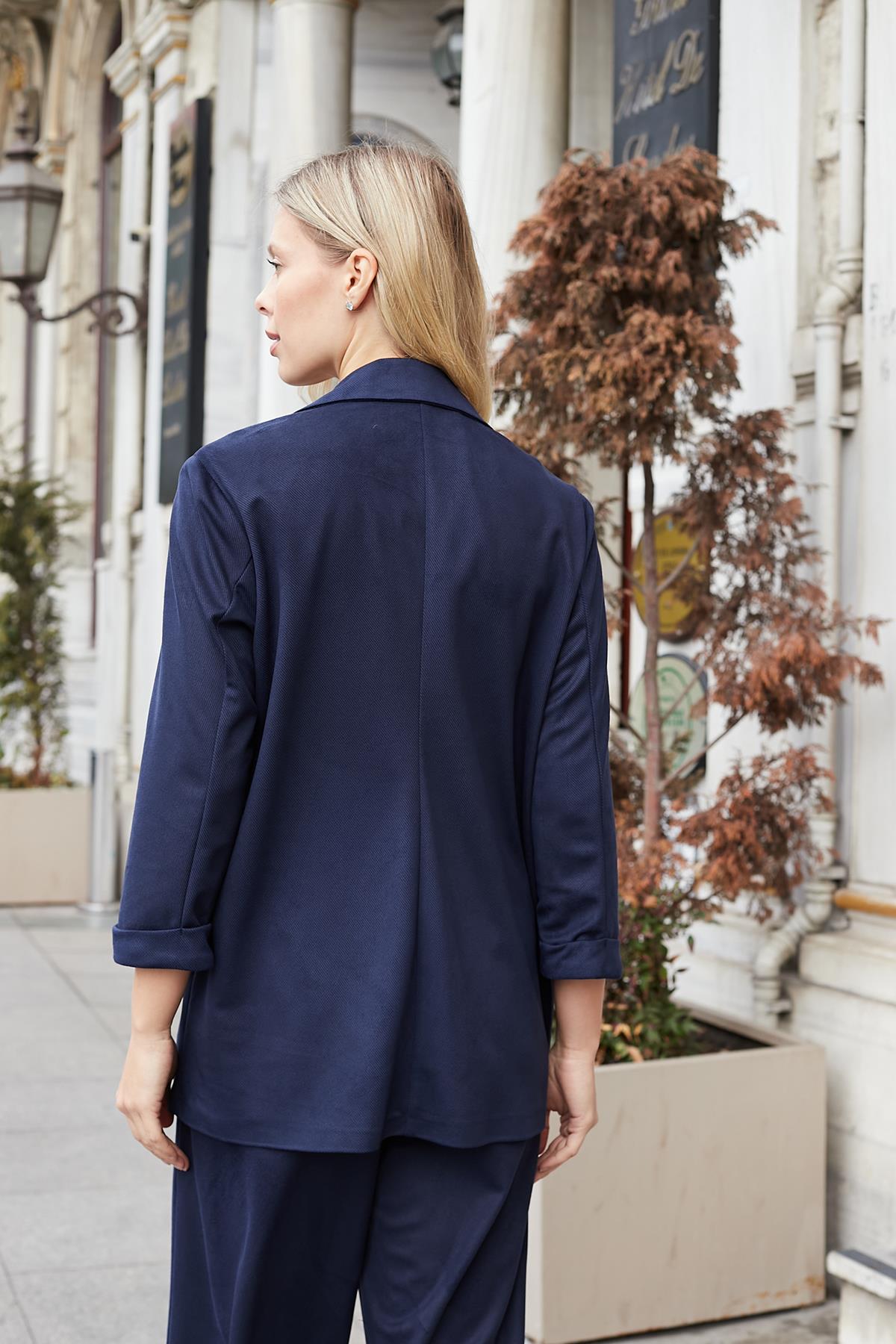 Kadın Süet Dokulu Kumaş Yakalı Capri Kol Cep Kapaklı Blazer Ceket-Lacivert (30100)