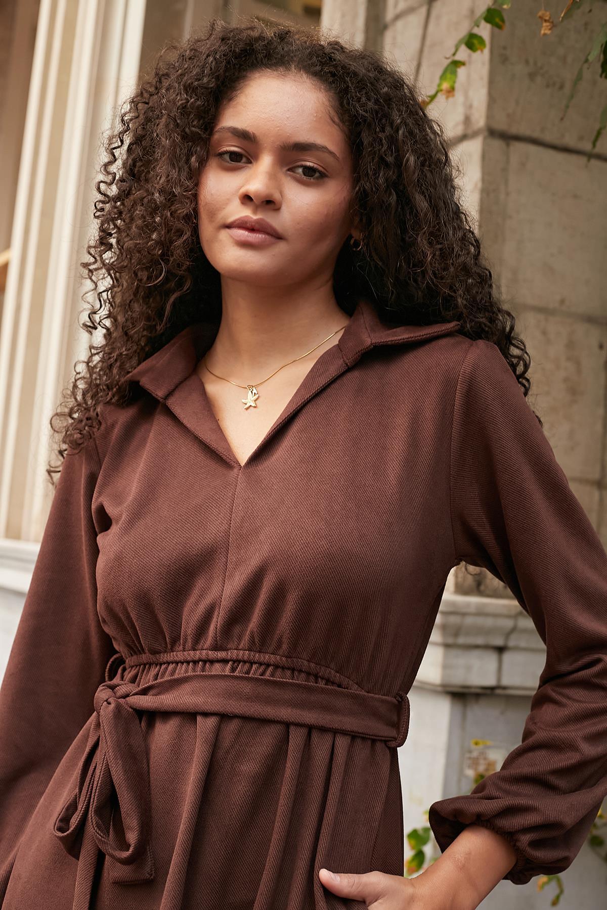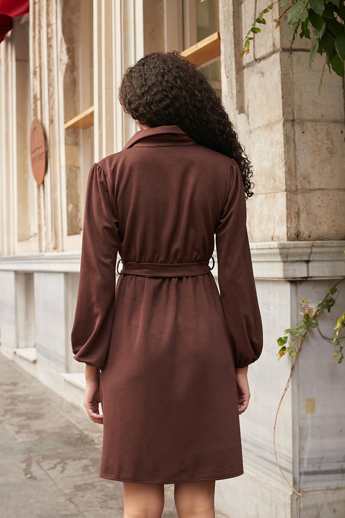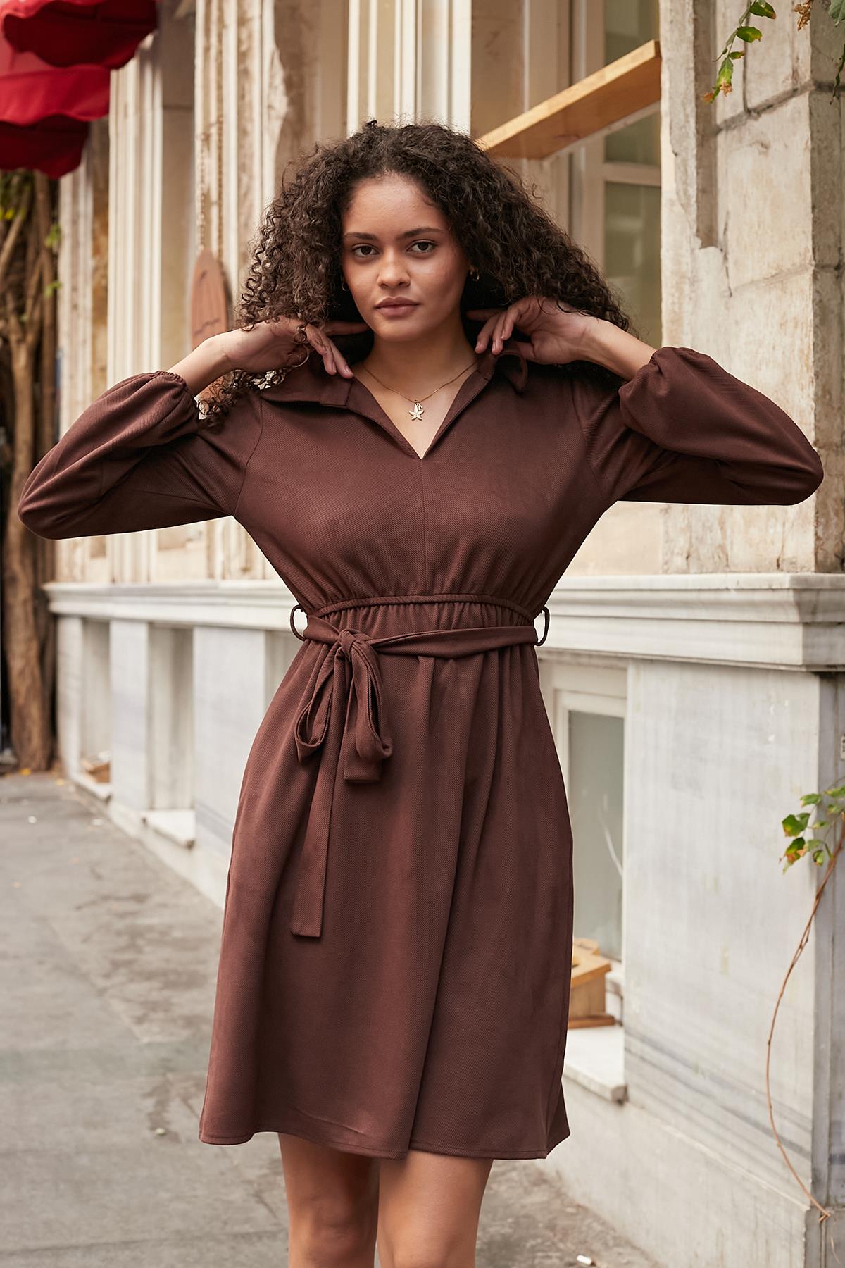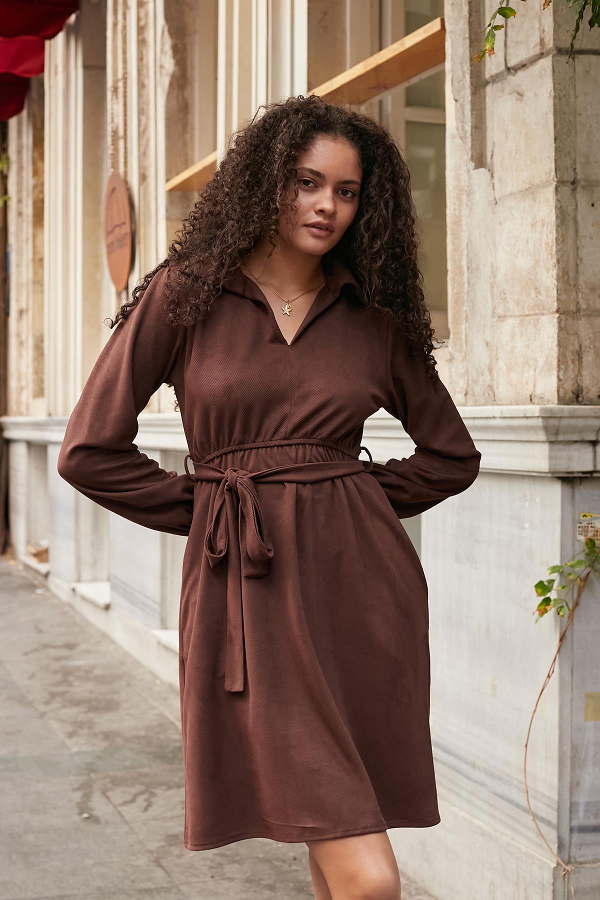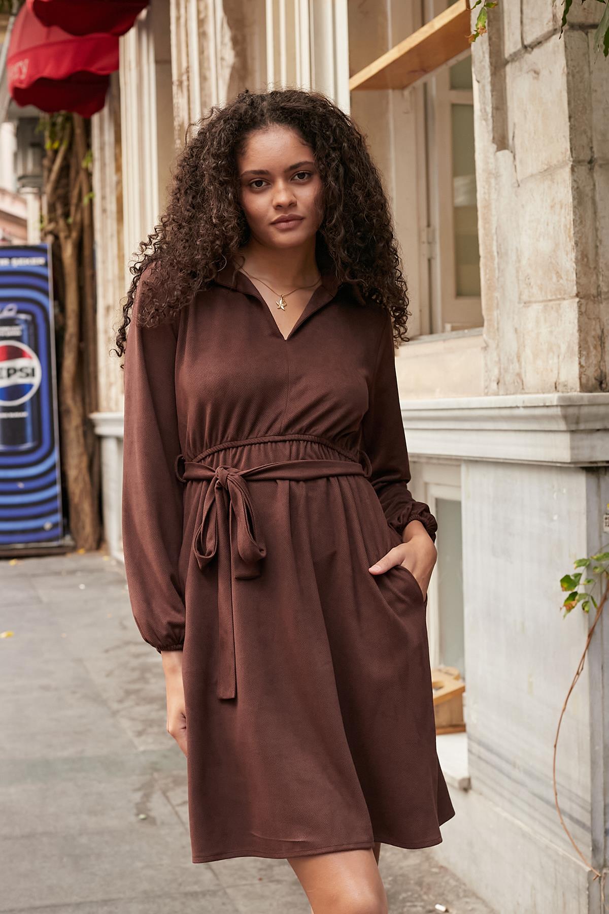 Kadın Süet Dokulu Kumaş Yakalı Uzun Kol Bağcıklı Cepli Diz Üstü Ofis-Günlük Elbise-Kahve (50234)