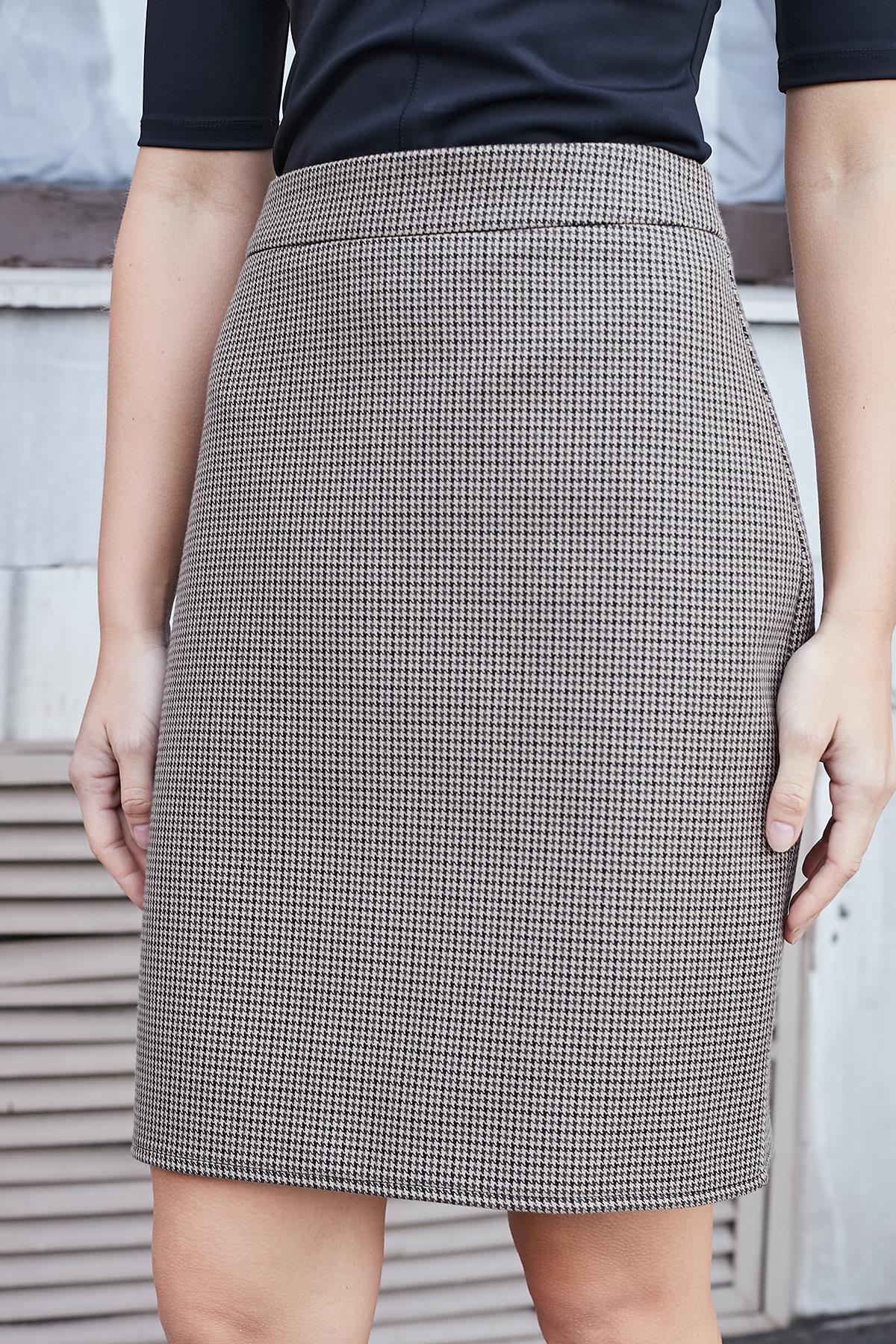 Yüksek Bel Diz Üstü Hafif Likralı Şık Kumaş Kalem Etek-Kahverengi Kazayağı (100025)