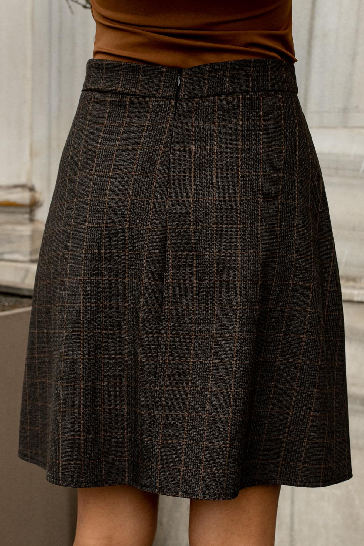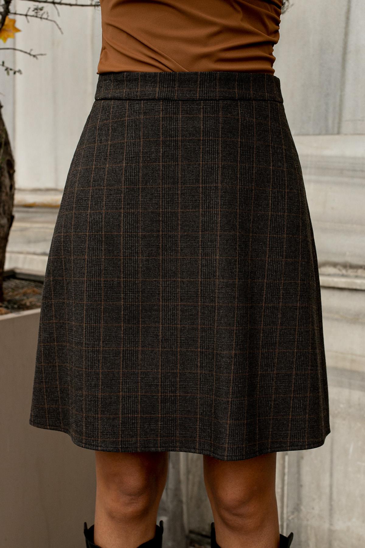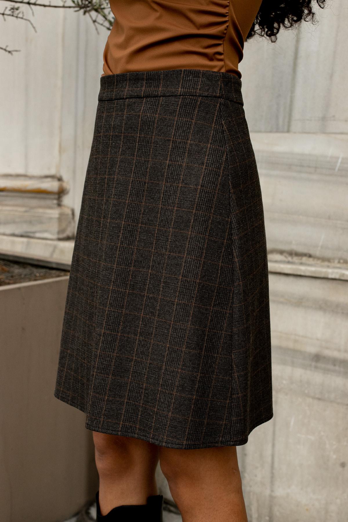 Yüksek Bel Hafif Likralı Kumaş Diz Boy Çan Etek-Kahve Ekose (100073)